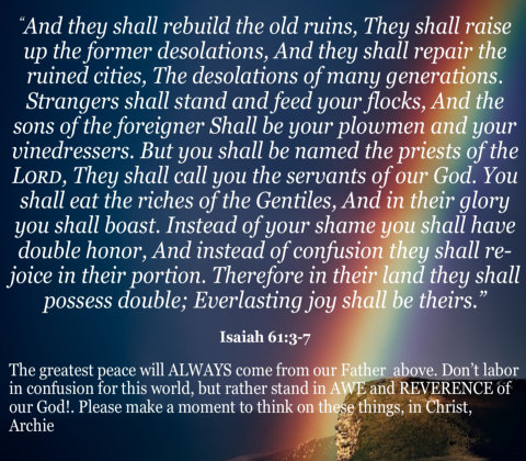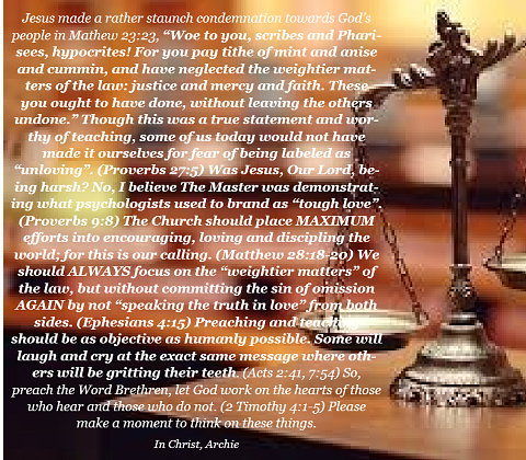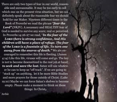 A very popular song includes the refrain, "Our God is an awesome God he reigns From heaven above with wisdom, power and love." This is one of many descriptions, and I would personally say a very appropriate title, for our God. Webster's defines awe as "mingled dread, veneration, and wonder". Awe can refer to Him personally and even to His work. Therefore, we see His remarkable handiwork in the framing of the "worlds". We recognize His perfection in His judgment, mercy and longsuffering. Even in His authority, we can glimpse into an awe-inspiring desire for His creation to obey Him fully and be redeemed. Isaiah 6:5 Can we as individuals or as a nation humbly submit to the tremendous greatness of Heaven and allow God's wisdom, power and love to enrich our lives as the song implies? Psalm 12:6 I pray we never willingly sing words like this in vain. Jeremiah 2:19 Remember His awe can work for us or against us. Romans 11:22 He leaves the decision up to us. Please make a moment to think on these things. In Christ, Archie