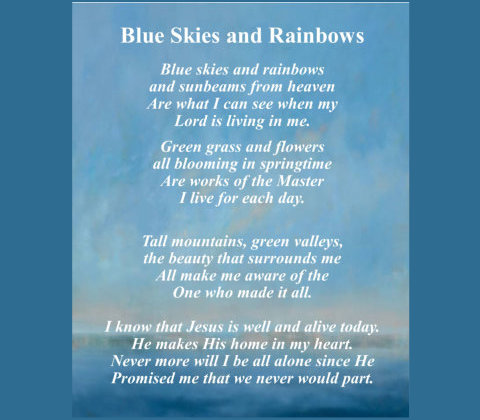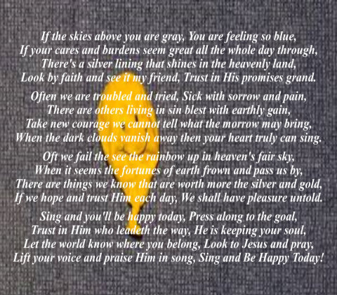 If the skies above you are gray, you are feeling so blue, if your cares and burdens seem great all the whole day thru, there's a silver lining that shines in the heavenly land, look by faith and see it my friend, trust in His promises grand. Often we are troubled and tired, sick with sorrow and pain, there are others living in sin blest with earthly gain, take new courage we cannot tell what tomorrow may bring, when the dark clouds vanish away then your heart truely can sing. Oft we fail to see the rainbow Up in heaven's fair sky, when it seems the fortunes of earth frown and pass us by, there are things we know that are worth more than silver and gold, if we hope and trust Him each day, we shall have pleasure untold. Sing and be happy press along to the goal, trust Him who leads you, He will keep your soul: Let all be faithful, Look to Jesus and pray, lift your voice and praise Him in song, sing and be happy today. "Is anyone among you suffering? Let him pray. Is anyone cheerful? Let him sing psalms." James 5:13 Please make a moment to think on these things. Archie