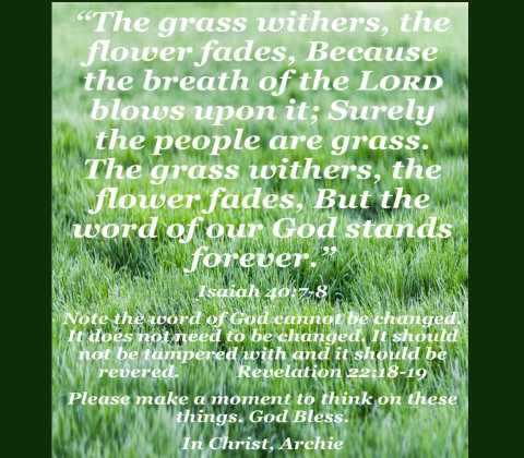 "In with the NEW and out with the OLD" is a common phrase today. Today's economic system depends on a very temporal, emotional and microwavable consuming nation. As soon as you purchase something, take it home and remove it from the box, it has become "outdated". To a certain degree, some things should change...even need to change, but does EVERYTHING? A religious society has a tendency to believe the same thing about the Word of God. Some say the Cross and its meaning have become "old fashioned". Many cry out for a more MODERN prophet; unlike the Biblical Jesus. While still others bemoan the Gospel message and label the need to obey it as "antiquated". Is it possible, somehow or someway to "sidestep" or divert salvation away from the God of the Bible for "new gods" and a "new religion" and still be saved? In this simple man's opinion, no. God told His people of old, "Therefore be careful to observe them; for this is your wisdom and your understanding in the sight of the peoples who will hear all these statutes, and say, 'Surely this great nation is a wise and understanding people." Deuteronomy 6:4 When Joshua came along and replaced Moses as their human leader, he was informed by God "do not turn from it to the right hand or to the left" Joshua 1:7 or he would not prosper. By the time Jesus arrives on the scene to spread the Good News of life eternal, it had already been established by principle to the congregation in the wilderness, Leviticus 19:2 We are nothing without the righteousness of God. If we live at all, it is because He lives and has given us the opportunity to be saved according to His design; not one of our own. Romans 1:17 Let's lay aside the "latest gadget" mindset and trust in the Lord who knows better than we ourselves. Place our wisdom where it belongs...in the trash and keep it there! 1 Corinthians 1:18-25 If the "old" saves, we can't use anything which might resemble "new". Jeremiah 6:16 Please make a moment to think on these things. In Christ, Archie